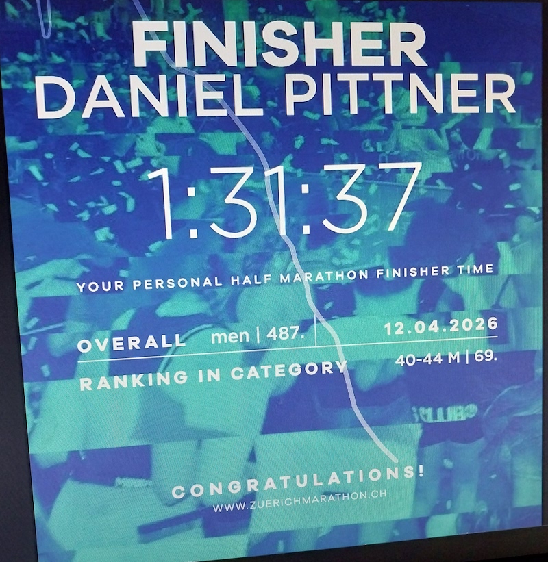 Daniel Pittner von der VLG Eisenbach hatte für den Halbmarathon gemeldet. Auch er zeigte eine starke Leistung und beendete sein Rennen mit der Zeit von 1:31:37, was ihm Platz 69 in der M 40 und Rang 487 in der Gesamtwertung einbrachte.