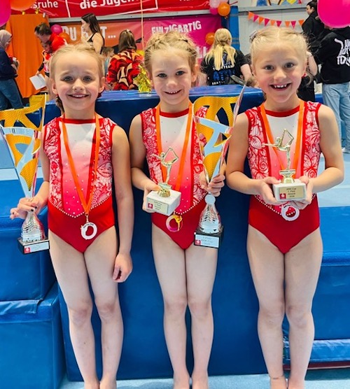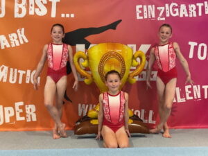Der zweite Tag startete mit den jüngsten Turnerinnen der Altersklasse 6 und Anni Wahler, Nele Harder sowie Lina Wecker sorgten für eine faustdicke Überraschung. Mit souveränen Vorstellungen in der Athletik sowie an den Geräten dominierten sie den Wettkampf. Bei der Siegerehrung war die Freude groß als es hieß: 1. Platz für Anni Wahler, 2. Platz für Nele Harder sowie Rang 4 für Lina Wecker im Teilnehmerfeld von knapp 40 Turnerinnen. Und sowohl der Athletik- als auch der Technikpokal ging an die Turnerinnen der TTS-Limburg-Elz; ein toller Erfolg!