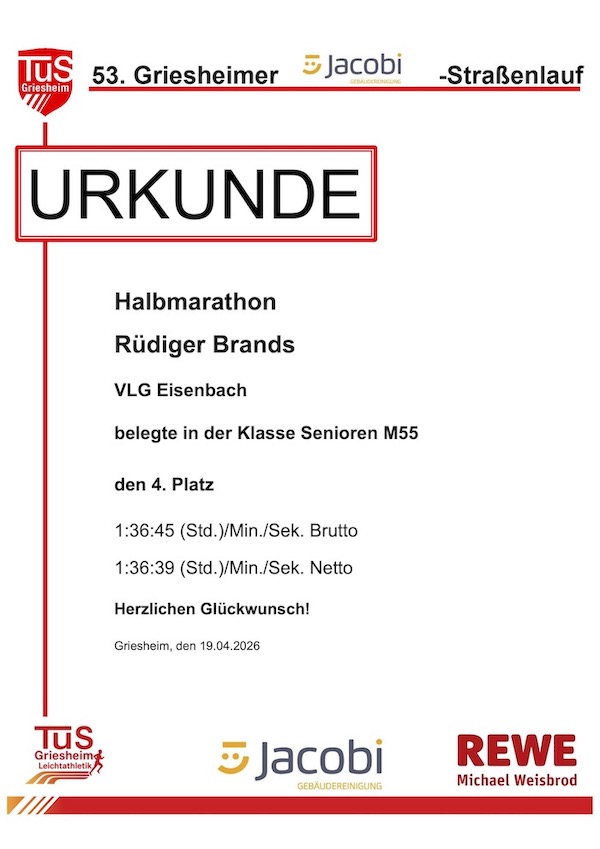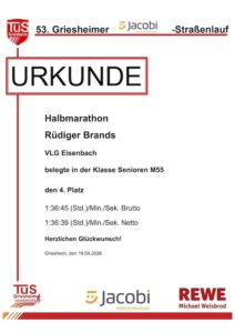 Platz vier für Rüdiger Brands VLG beim Halbmarathon in Griesheim